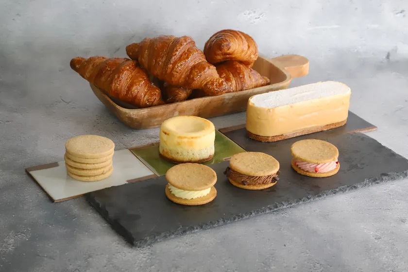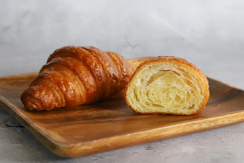 お店の厨房で毎日焼き上げるRAKUTOオリジナルクロワッサンです。フランス産発酵バターを贅沢に使用することで、芳醇なバターの香りをお楽しみいただけます。生地を何層にも織り込んで焼き上げることで生み出される空気の層により、さっくりとした心地よい食感をもたらします。