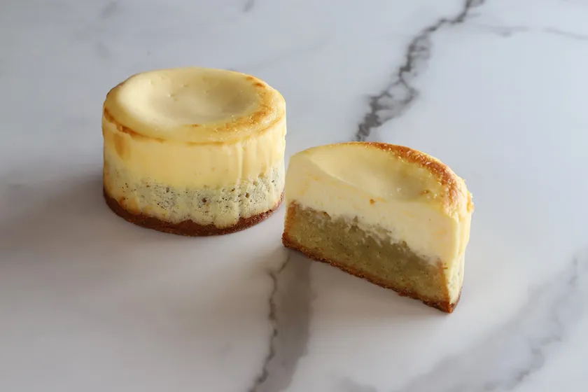 毎朝その日分を工房内で焼き上げる、数量限定の焼きたてチーズタルトです。2度焼きでさっくり食感を実現したバニラ香るタルト生地の上に、クリームチーズとマスカルポーネチーズのなめらかなアパレイユを流し込み、絶妙な火加減で焼き上げました。一口目に感じるトロリとした半熟の食感は感動していただくこと間違いなし。焼きたてのチーズの香りとサクサクのタルト食感をお楽しみください。
