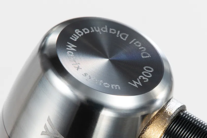 微細な音の粒子を感じるほどに、全帯域にわたって極めて鮮明で瑞々しいサウンドを実現しました。チタニウム合金は、強さ・軽さ・耐食性といった様々な面で優れた物性を示し、人体との親和性が高く医療や航空技術などの繊細な工業分野で活用されています。オーディオの分野においても、音響特性から得られる美しいサスティーン(音の余韻)を活かし、エレキギターなどの楽器の部品素材としても注目されています。難削材とされるチタニウム合金は加工性が低く、深く黒みを帯びた精緻な仕上がりは何ものにも代えがたい風格を備えています。