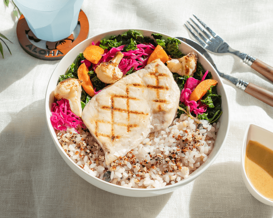 大きなメカジキと彩り豊かなグリル野菜が目を引く、GONNA DAYSならではのバランスを追求したライスボウル。ベースには、穀物の香ばしさと程よい食感を楽しめるよう、白米に十五穀米を混ぜ炊き上げたご飯にキヌアを添えています。主役のメカジキは、表面を高温で短時間焼くことで旨みを閉じ込め、しっとりと仕上げました。ドレッシングは、醤油をベースに香味野菜のコクと甘みそして程よい酸味が、隠し味であるアンチョビの旨みと調和しています。メカジキにもご飯にもなじみ、全体をまとめる味わいです。彩り豊かな野菜は、グリルして甘みと香ばしさを引き出すことで、主役の味をバランス良く引き立てています。軽やかでありながら満足感があり、素材の組み合わせや彩り、野菜の使い方まで考え抜いた、ヘルシー&ボリューミーなワンボウルです。