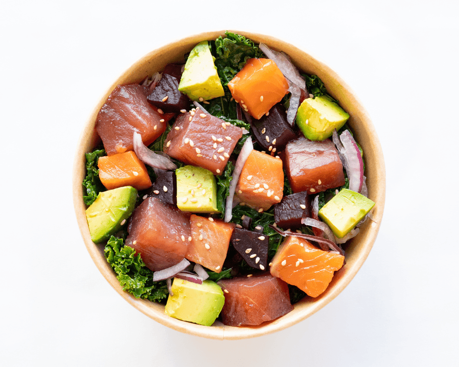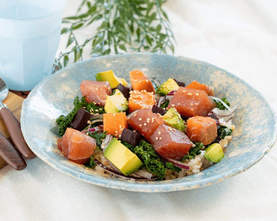 ハワイのポキ丼から着想を得て生まれた当商品のベースには、穀物の香ばしさと程よい食感を楽しめるよう、白米に十五穀米を混ぜ炊き上げたご飯を使用しています。主役のポキは、マグロとサーモン。牡蠣醤油を使用したコクのある特製ダレに漬け込み、海鮮本来の旨みを引き立てました。自社農園で育てた野菜の王様と言われるケールや、ミネラルや葉酸を豊富に含むと言われているビーツ等の西洋野菜を組み合わせることで、コクのある味わいに軽やかさを添えています。まろやかなアボカドが全体をやさしくまとめ、ご飯との相性も抜群。