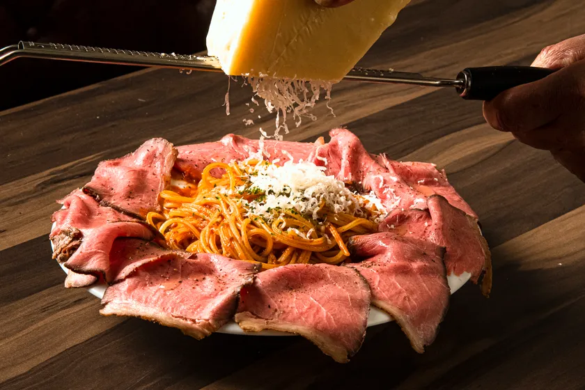 ローストビーフをふんだんに使用し、豪快に食べるボロネーゼ