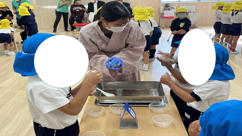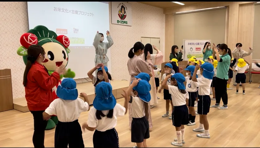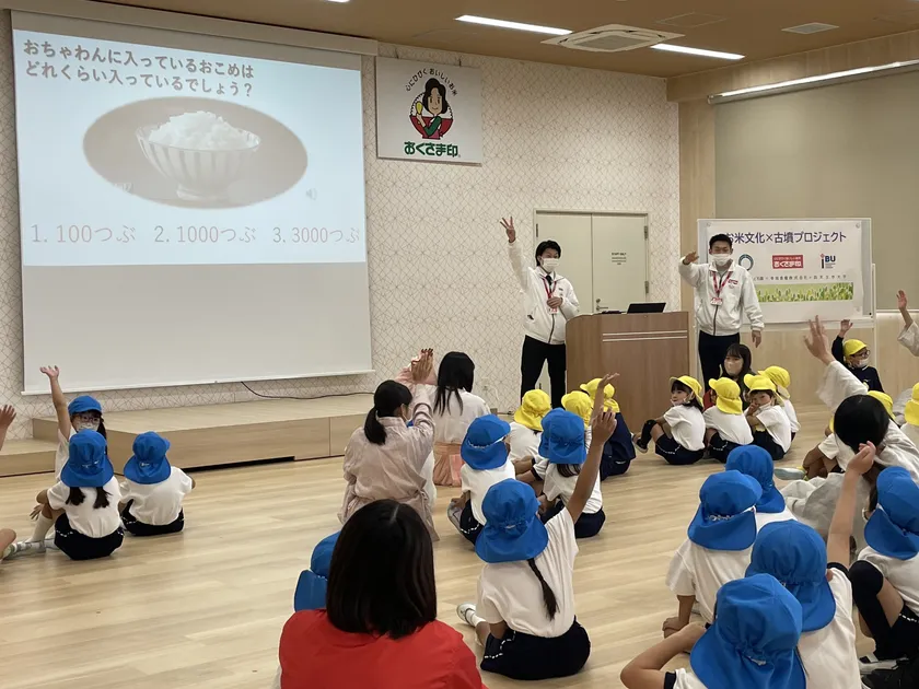 世界遺産「古市古墳群」が広がる大阪府羽曳野市の四天王寺大学と、大阪府松原市で数多くの精米商品を手掛ける幸南食糧株式会社は、10月27日に松原市立わかばこども園の園児46名を招待し、「お米文化×古墳プロジェクト」と題したイベントを実施しました。このイベントは、日本の食文化の中心である「お米」と世界遺産の「古墳」を園児たちに親しんでもらおうと企画したもので、幸南食糧の若手社員が、クイズ形式でお米について説明し、本学の学生9名が「古墳音頭」を園児たちと一緒に踊りました。その後、炊き立てのお米(あきたこまち)でおむすびを作り全員で試食。お米本来の味を味わってもらいたいという幸南食糧の思いから、具材はなしでしたが、園児からは「おいしい」といった声が溢れました。