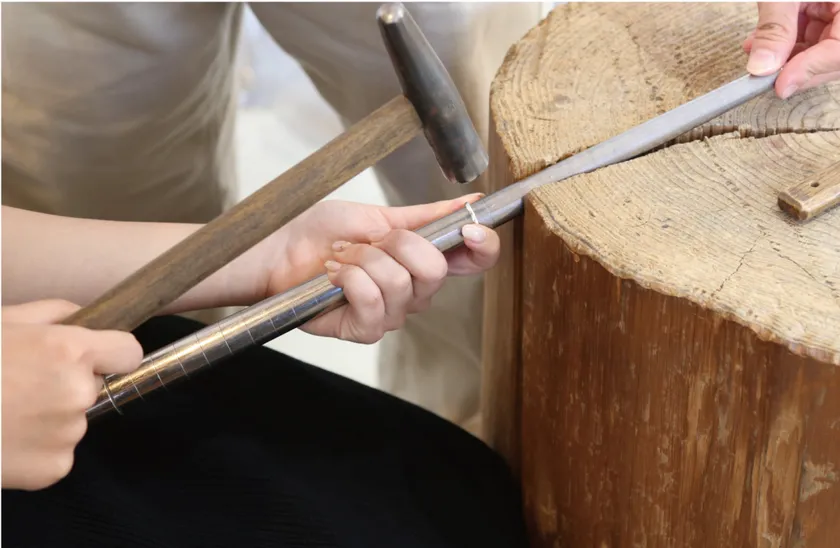 体験内容は、金鎚で模様を打ちだす「鎚目加工」とリングの内側に数字やイニシャルを刻む「刻印入れ」の2つのコースを体験できます。所要時間は約1時間半で、当日にお持ち帰りいただけます。
