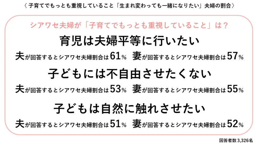 もっとも高かったのは、時代感を反映するような「育児は夫婦平等に行いたい」。妻と比較し、夫が「平等に~」と回答している方がシアワセ夫婦割合が高いのは、一般的に育児負担が妻に偏りがちであることを考えるとうなずけますね。
