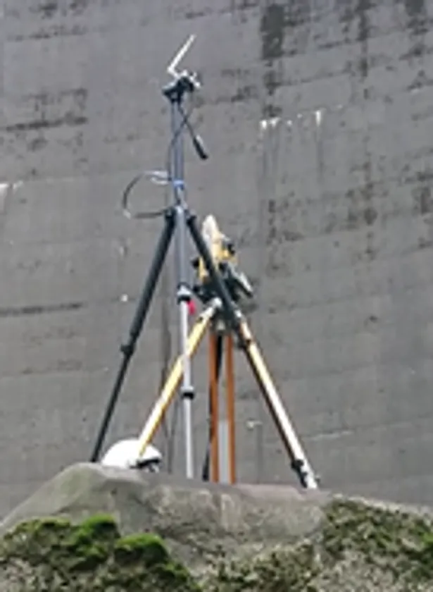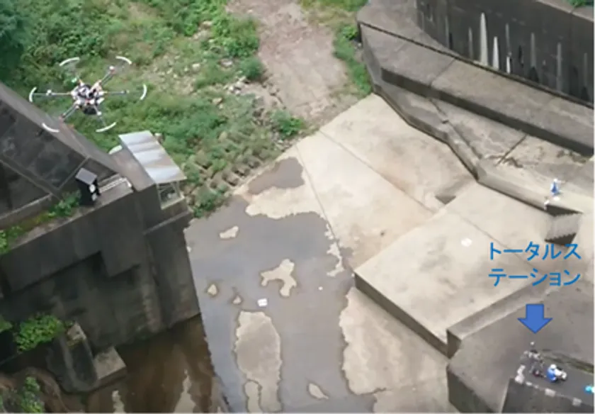 宮城県の鳴子ダムは山の谷間にある高さ94.5mのアーチ式コンクリートダムで、地形的にGPSを使ったドローンでは位置情報の誤差が大きくなり正確な自律飛行ができません。また、巨大な構造物のためVisual SLAM方式も適しておりません。当社が独自に開発したTSコントロール飛行システムは、測量機器であるトータルステーション(TS)でリアルタイムにドローンの位置を捕捉することにより、正確に位置決めしながら半径数百メートルの範囲を自律飛行することができます。今回このシステムを使い八千代エンジニヤリング株式会社様監督のもと当該ダムの自律飛行点検用の画像撮影を予定のスケジュール通りに滞りなく実施いたしました。
