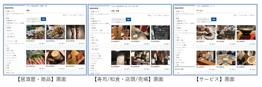 集客プロ内の画像や動画には、飲食コンサルタントによる解説・コメントが付いているので、集客のポイントを分かりやすくつかむことができます。画像と動画を15の業態(「居酒屋」「イタリアン」「焼肉」など)×3つの項目(「メニュー」「商品」「店頭・売場」)に分類していますので、業態別にご覧いただける仕様になっています。