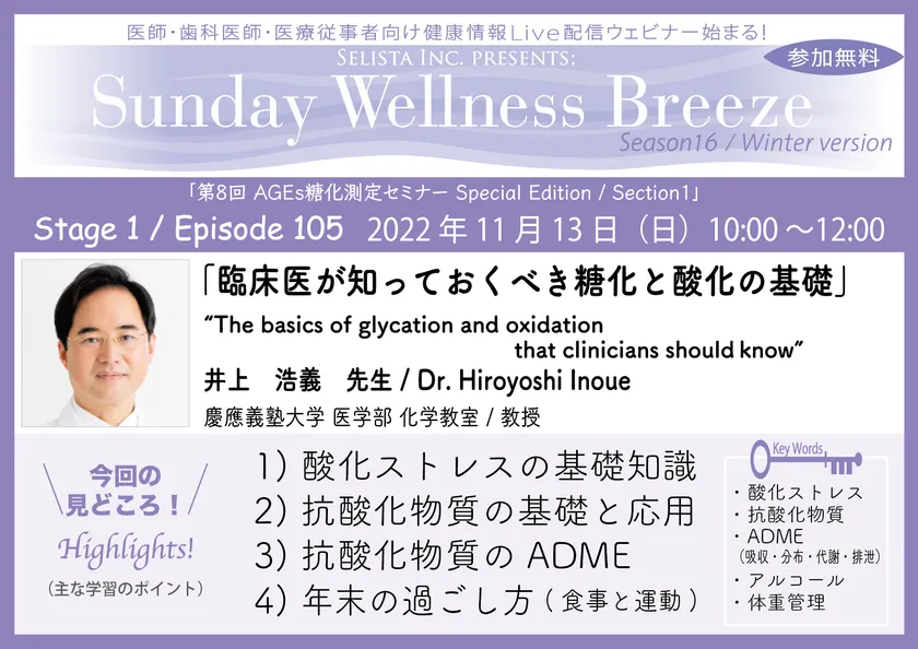無料オンラインセミナー 『臨床医が知っておくべき糖化と酸化の基礎』11/13(日)開催 講師:井上 浩義先生(慶應義塾大学 医学部 化学教室 / 教授) ※医師・歯科医師・薬剤師・医療従事者限定無料