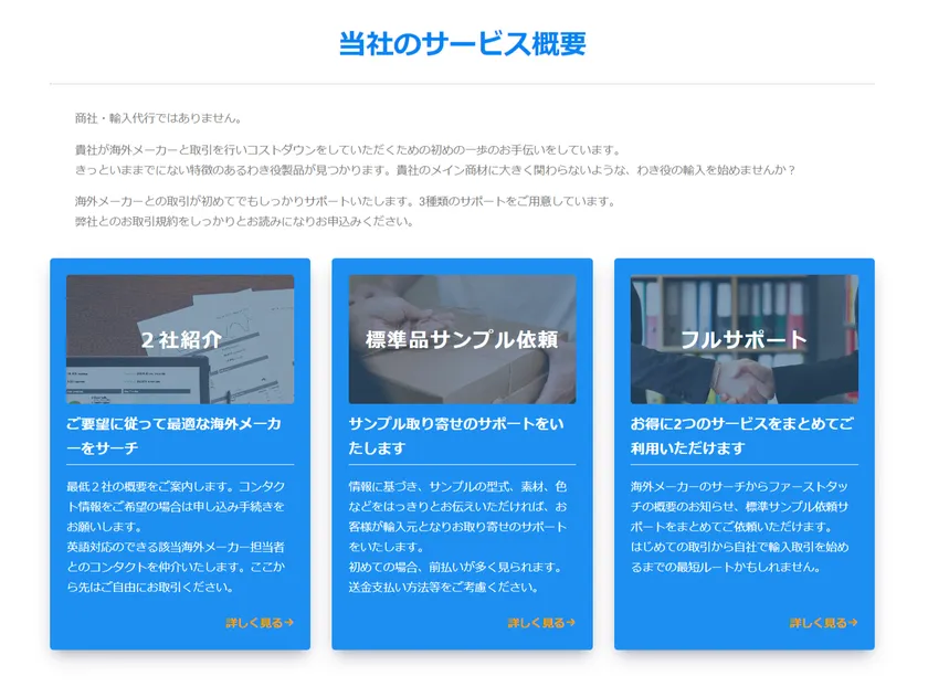 ご要望をお聞きし、適合しそうな2社の連絡先を相手先と実際に問い合わせし一つ一つ丁寧にお知らせ。その後は貴社にてご自由に取引。その後の取引にかかるコミッション等は一切発生しません。