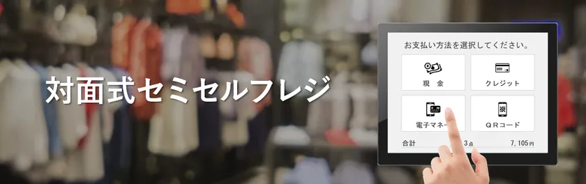 「対面式セミセルフレジ機能」とは、商品バーコードの読み取りや袋詰めをスタッフが行い、会計操作は別画面上でお客さまご自身で行っていただける機能です。現金の受け渡し等による感染リスクを減らすとともにレジ対応にかかる時間も削減できます。
