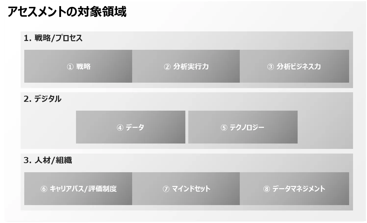 本サービスは、「戦略/プロセス」「デジタル」「人材/組織」の3領域、計8テーマに対してインタビューを実施し、各種資料なども確認したうえで、企業のデータ活用状況を把握するためのアセスメントを実施します。