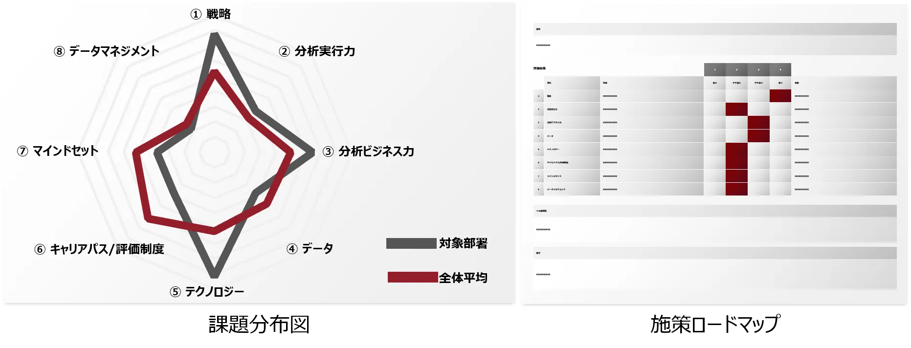 ・可視化された課題や現状を構造化し、今後のデータ活用のロードマップ案を作成し、より具体的・実践的にデータ活用を進めるための提案を行います。