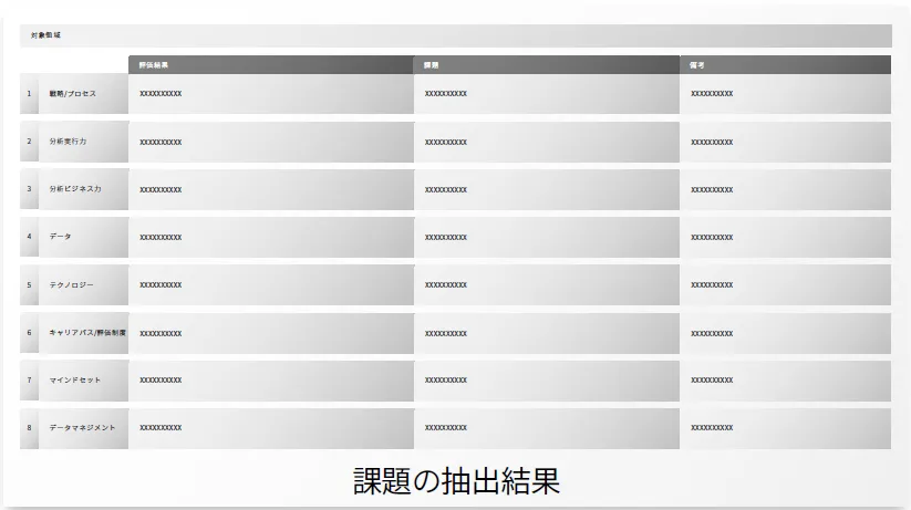 ・評価結果をもとに、現状のデータ活用状況に対する課題を抽出します。