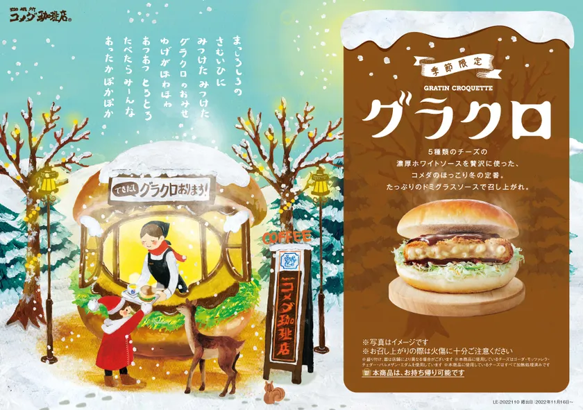 コメダの冬の定番「グラクロ」の季節がやってきました。今年のグラタンクロケットは、昨年ご好評をいただいた5種のチーズと生クリーム、北海道産クリームを使用したクリーミーなホワイトソース仕立て。チーズは、ゴーダチーズ、モッツァレラチーズ、チェダーチーズ、パルメザンチーズ、エダムチーズの5種を使用しています。生クリームと北海道産クリームのクリーミーな味わいにチーズの奥深いコクと風味を加えたホワイトソースが自慢の逸品。あつあつのグラタンをサクサクの衣で包み、じっくり煮込んで野菜の旨味を引き出したコメダ特製ドミグラスソースを絡め、キャベツとともにバンズに挟みました。お好みでペッパーソースをかけるとピリリと引き締まった味わいをお楽しみいただけます。寒い季節にぴったりの、心も体もあたたまる「グラクロ」で、ご家族やご友人と一緒に、ほっこり&おいしい時間をお過ごしください。