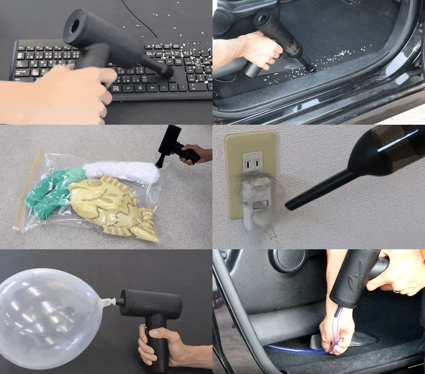本商品は、超強力噴射・強力吸引可能なハンディークリーナーです。アタッチメントの使い方次第で何通りもの使い方が可能なため、幅広いシチュエーションで活躍します。毎日使う車やPC周りの掃除に使用する電動エアダスター・ハンディー掃除機としてや、衣類の収納や食べ物の密封保存のために使用する吸引器、焚火や風船・浮き輪などのアウトドアレジャーでのブロワーとしてもご使用可能です。