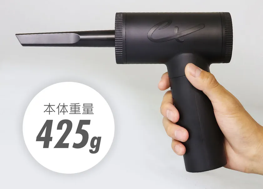 噴射の反対側が吸引となっており、クリーナーアタッチメントを装着すれば強力吸引のハンディー掃除機になります。車でのお子様のおやつの食べこぼしや、ご家庭の小さなごみに気が付いたときにサッと使えるコンパクト設計です。