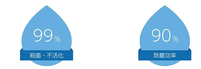 *1:独自のたんぱく質触媒により、ウイルスの持つエンベロープを溶解し、捕集した細菌やウイルスを99%以上殺菌・不活化します。