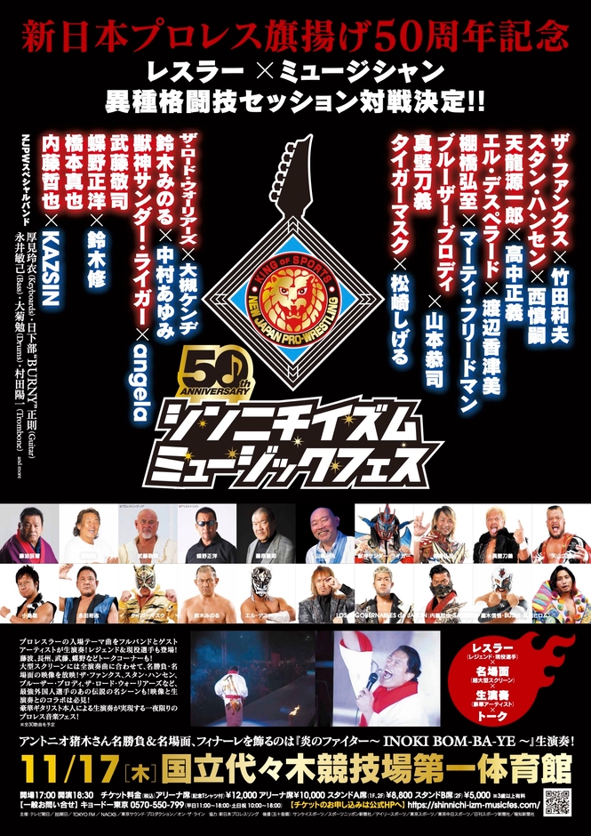 11 月 17 日に東京・代々木競技場第一体育館で開催される、新日本プロレスの 50 周年を記念した一夜 限りの音楽フェス「シンニチイズム ミュージックフェス」のオリジナルポスタープレゼント企画が実施 されます。