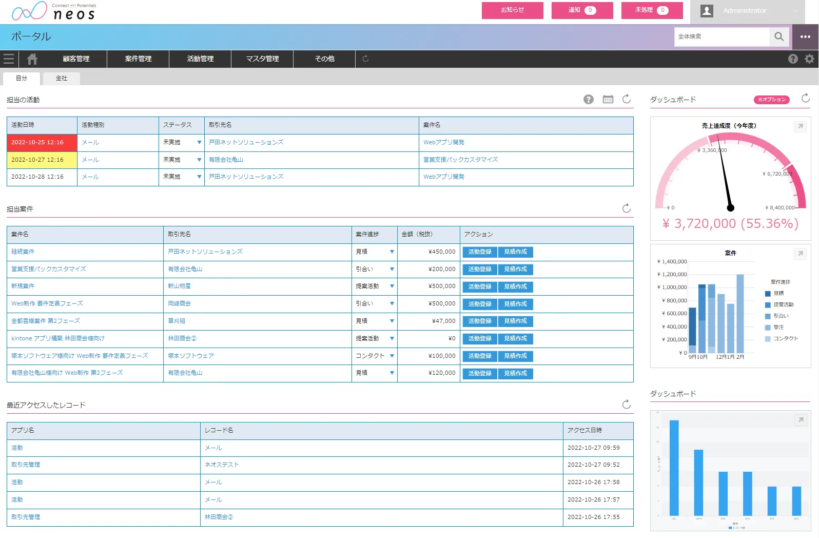 この度開発した【営業支援DX on kintone】は、ネオスがもつCRM・SFA※ソリューションの知見やUI/UXノウハウにより、「営業担当者のニーズを具現化する」テンプレートです。必要なデータへ素早くアクセスできる設計・機能を備えたポータル画面や、一覧性が高く進捗管理に最適な各種画面、業務に役立つ多彩なプラグインの標準搭載など、kintoneをより使いやすく快適なユーザビリティにカスタムし、日々の進捗管理や営業活動の効率化を実現いたします。加えて、外部ツールや業務システムとの連携、受注後の管理や経理処理に対応した拡張機能など、ユースケースに応じた柔軟なカスタマイズにも対応しております。