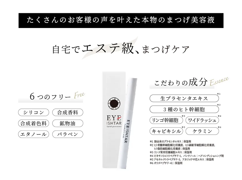 『生プラセンタエキス』※1に加え、3種のヒト幹細胞培養液※2、さらにはリンゴ果実培養細胞エキス※3・ワイドラッシュ※4・キャピキシル※5・ケラミン※6などの美容成分もふんだんに配合。