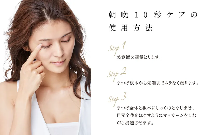 朝晩1日2回指に適量を取りまつ毛の根元から先端までムラなく塗り、目元全体をほぐすようにマッサージをしながら浸透させることでまつ毛だけではなく目元のケアもお手軽に行うことができます。
