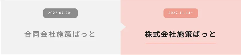 この度、当社施策ぱっとは「East Venturesからの出資」を受けるため、2022年11月14日をもちまして「合同会社施策ぱっと」から「株式会社施策ぱっと」へ変更いたしました。
