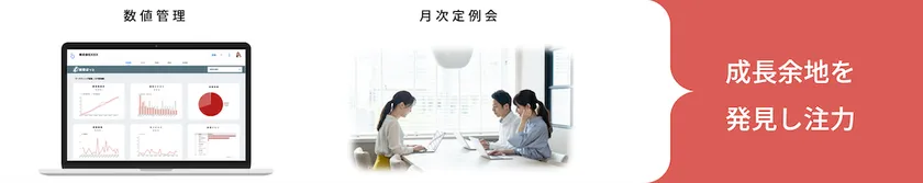(3)「各社専用の数値管理画面」をもとに月次の定例会で改善しているため、提案/実装/進捗管理/改善を一気通貫でサポートさせていただいております。