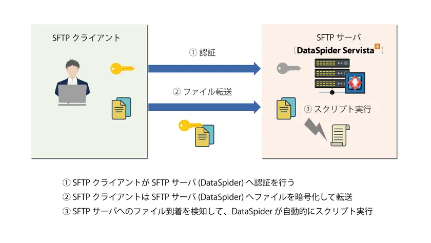 DataSpider Servistaは、SFTPサーバの役割を担い、SFTPによるファイル転送を行うことができます。また、DataSpider Servistaはトリガー機能を有しており、ファイル到着確認後は、トリガーを発火させてスクリプトを実行することができる為、単なるセキュアなファイル転送のみでなく、転送後の処理の自動化連携が可能です。
