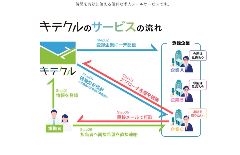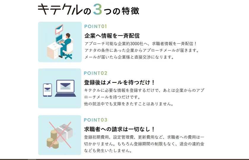 「キテクル」に必要な情報を登録するだけで、あとは企業からのアプローチメールを待つだけです。