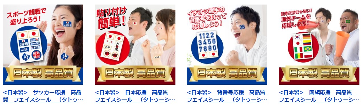 応援に使用しやすい国旗や、サッカー観戦という非日常的な場面で気持ちを盛り上げてくれるグッズや、感染症対策が必要な昨今に必要な衛生対策用品も取り揃えております。