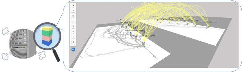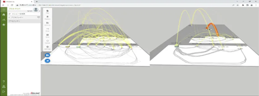 また、この3次元可視化技術は、業務の実行プロセスを比較することができる機能が備わっているため、同じ視点から月初、月末の比較をすることや、業務改善前後における変化を確認することができます。これによって、システムの改修効果を確認できるだけではなく、さまざまな業務の進め方に応じたシステム利用の違いも確認することができます。
