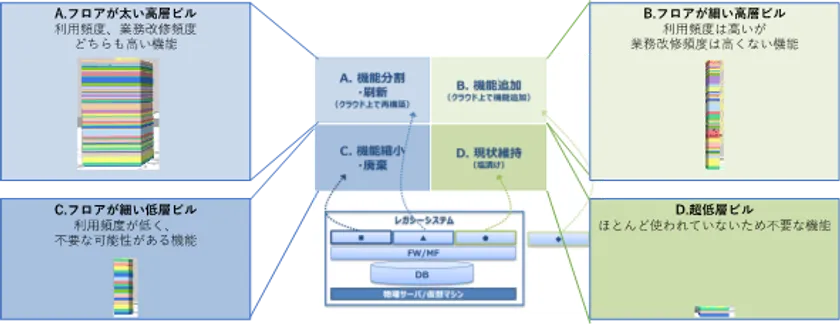 経済産業省が発表したDXレポートでは、レガシーシステムを「機能分類・刷新」、「機能追加」、「機能縮小・破棄」、「現状維持」の4つに分類し、必要な機能をクラウドにて再構築・機能追加することを提唱しています。今回の検証結果では、システムの操作ログから実行プロセスを抽出・モデル化し、3次元で可視化を行うことができるため、レガシーシステムの分類を補助することが可能です。さらに、本技術をイントラマート社のクラウドサービス「Accel-Mart」に取り込むことでクラウド環境へのシステム移行も可能となります。