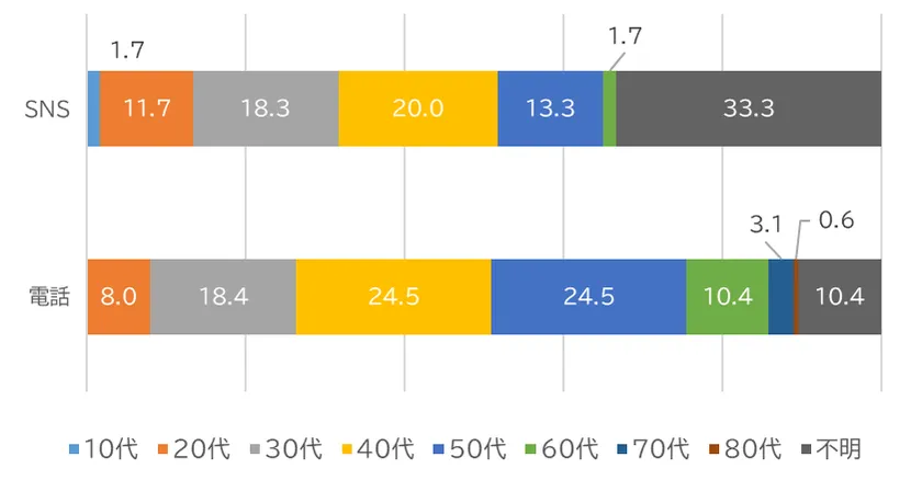 今回よりSNSを活用した相談に取り組みました。SNSの利用が日常化している今、いつでもどこからでもアクセスできるSNSを相談に活用することで、電話では言いにくいことや、周りの環境を気にせずに相談することができるなど、SNSのメリットを活かすことができました。今年は電話も含めた全体の相談数の3割近くがSNSに寄せられました。電話利用者は30代から50代が中心、SNSは20代から40代が主で(※)、より若年層にSNS利用者がシフトしていることがわかりました。