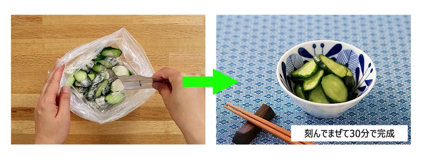 お好みの食材200gをよく水洗いして、食べやすい大きさに刻み、ポリ袋に食材と本品を入れてよく混ぜ合わせます。ポリ袋の空気をしっかり抜いて口を閉じ、冷蔵庫で30分ほど漬け込んだらできあがりです。