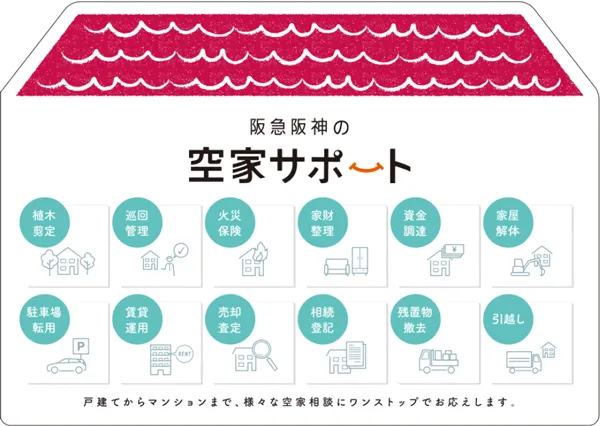 阪急・阪神沿線に空家をお持ちの方が抱える様々な問題に、ワンストップで対応するサービスです。具体的には、以下のメニューをご用意しています。