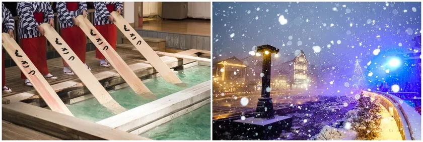 左:草津温泉の湯もみ、右:草津温泉 冬の湯畑