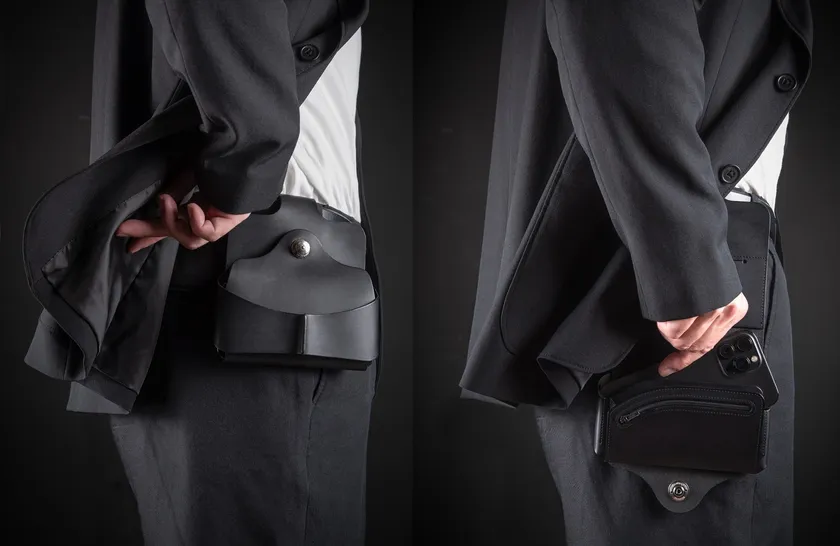 折り畳み時は背広やジャケットに隠れる設計、展開時に収納スペースがちょうど手の位置にくるように、いかに快適に使えるかを徹底的に考えられたデザインです。