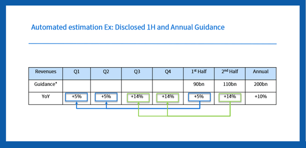 Market often focuses on the progress of the annual guidance (ie “achieving 60% of annual guidance in first half). This is important, but it is about the past and does not indicate much about the future, which could include seasonality or one-time factors that could be influencing the annual guidance. The system estimates the guidance for the remaining period, so you can focus more on the future forecasts.