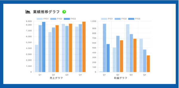 四半期予想は短期すぎるから、年度予想しか行わないという方も多いと思います。そのような方でも、四半期ごとの答え合わせをして、年度予想を確認したい要望があるようです。Gyosekiは、年度予想を自動的に四半期按分し、一目で確認できるグラフをご提供致します。