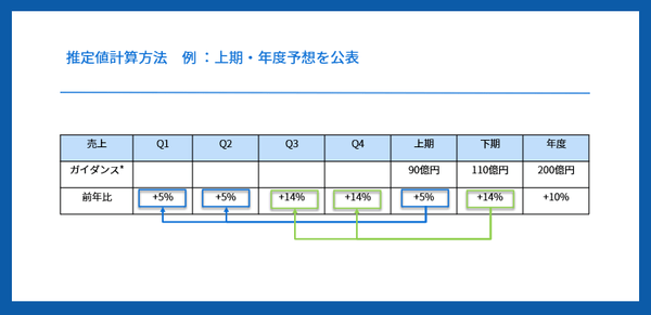 市場では、「上半期で会社年度予想の60%達成した」など進捗率をよく使用します。これはとても重要な指標ですが、進捗率は過去の実績であり、進捗率が良く見えても、将来のことは見えません。例えば、上期・下期の季節性や1四半期のみの一過性要因などがあるのかもしれません。Gyosekiは、将来予想により注目するため、残りの期間の会社予想値を参考値として推定いたします。