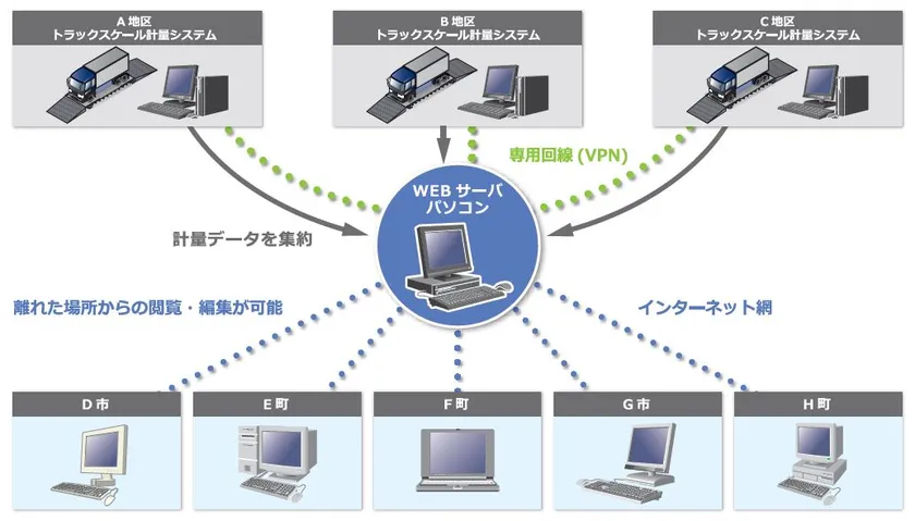 VPN(Virtual Private Network:仮想LAN)を使用することにより、各拠点が同一ネットワーク上に構成され遠隔での計量業務が可能になります。インターネット回線を使用するため安価に導入できます。
