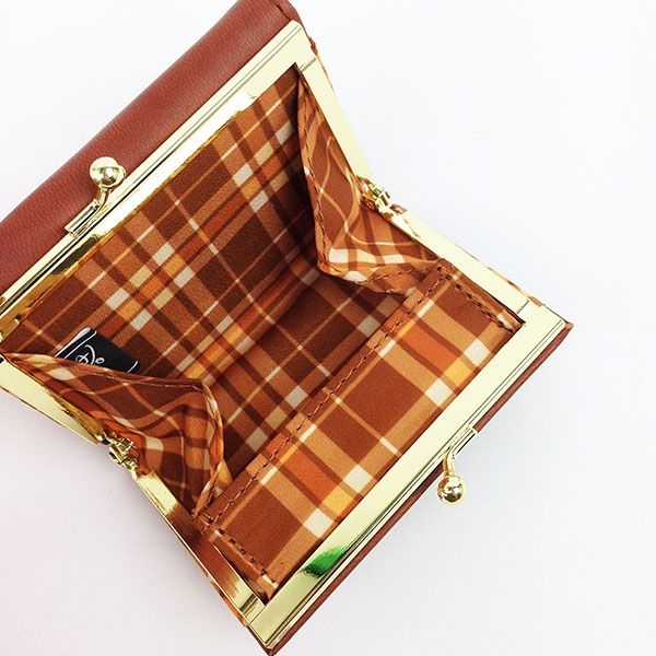がま口を開くと、内側はオシャレなチェック柄。色合いもシックですね。