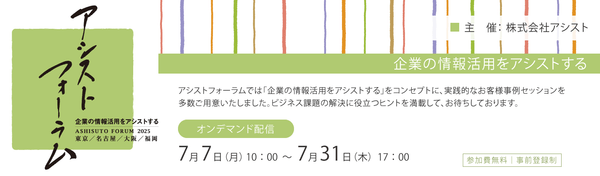 株式会社アシスト(本社:東京都千代田区、URL:https://www.ashisuto.co.jp/、以下「アシスト」)は、メーカー28社の後援のもと、顧客企業の先進的なIT活用事例を紹介する「アシストフォーラム2025」を2025年7月7日~7月31日の約4週間にわたり開催することを2025年5月12日付で発表します。期間中、23のIT活用事例セッションをオンデマンドで配信し、参加者は地域に左右されず全国の事例を自身の都合にあわせて何度でも視聴することが可能です。