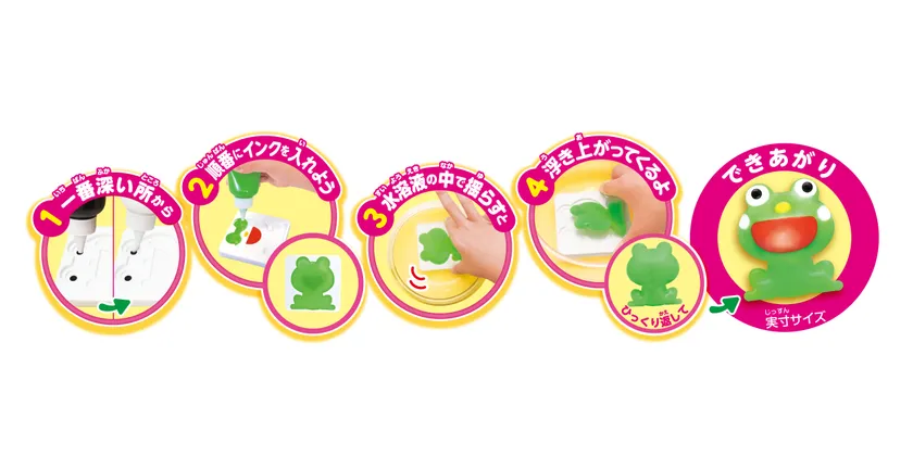 好きな型にカラーインクを流し込んでぷにょぷにょした生き物を作って遊べる工作キットです。なぜ固まるのか、どんな成分なのか遊びながら学べます。