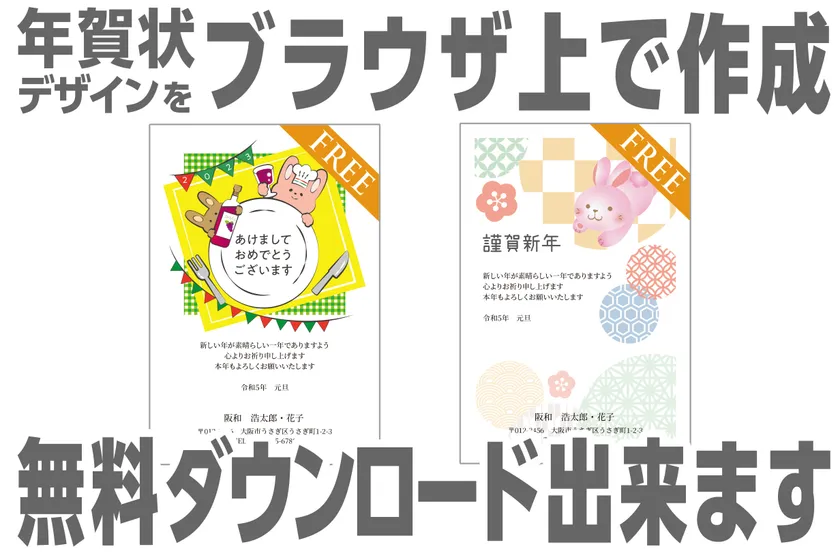 株式会社ハンワ(大阪市浪速区)は、年賀状印刷作成サイト「年賀はがき舎」内で、年賀状をブラウザ上でデザインし無料でダウンロード出来るサービスを2022年11月より開始しました。テンプレートに名前やご住所などを入力し、年賀状デザインを作成して無料で画像ダウンロード出来るサービスですので、専用ソフトやアプリなどを使わず簡単に年賀状が自宅で印刷できます。
