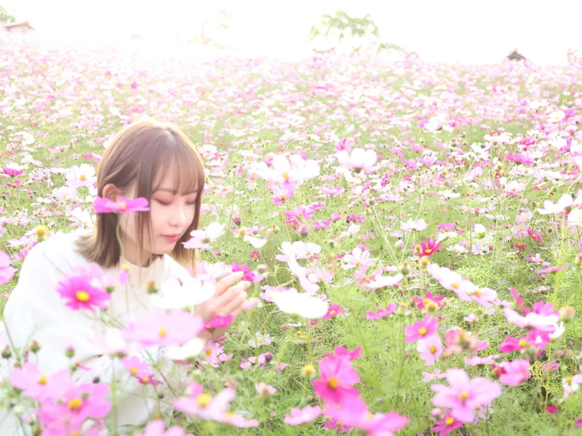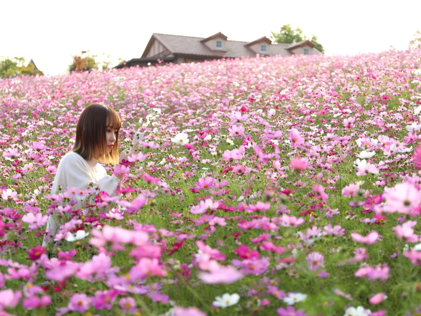 秋空の下、花畑一面に咲くピンク色のコスモスをお楽しみいただけます。