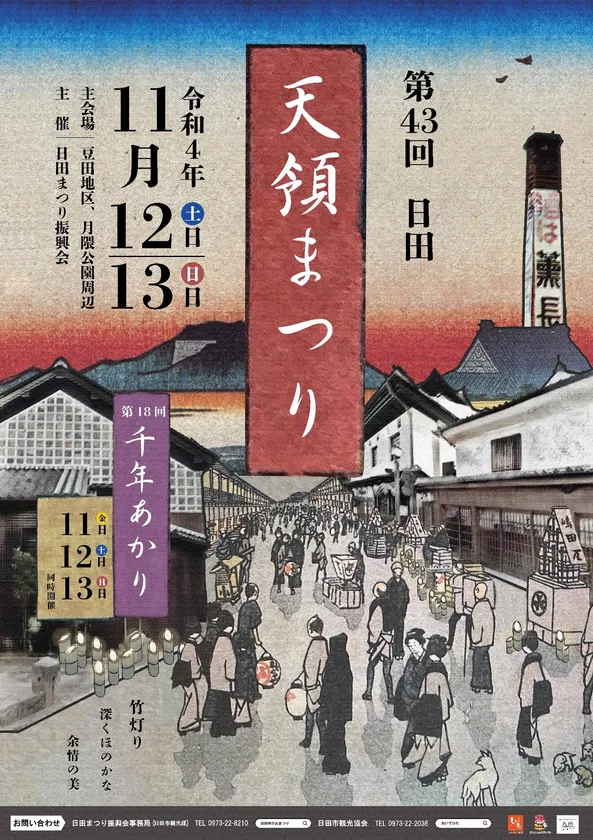日田まつり振興会は、2022年11月12日(土)と13日(日)の2日間、豆田地区・丸山地区を中心に第43回「日田天領まつり」を開催します。また、11日(金)からは花月川河川敷を中心に、無数の竹灯籠が幻想的に彩る「千年あかり」も同時開催します。