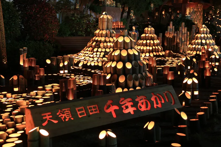 千年あかりは、市指定保存樹林に侵入した竹によって森林が破壊されるのを防ぎたい、林業が盛んな日田の自然を守りたいという、地元の人たちの思いで始まりました。地元の企業やボランティア団体など多くの人たちによって灯される2万本の竹灯籠の光には、日田の自然を愛する気持ちが込められています。