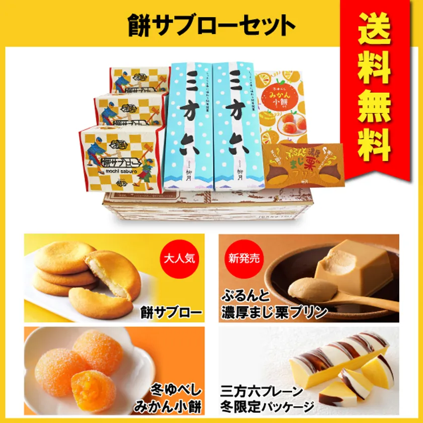 セット内容 : 餅サブロー(4枚入)×3、三方六 冬限定パッケージ(10切入)×2、