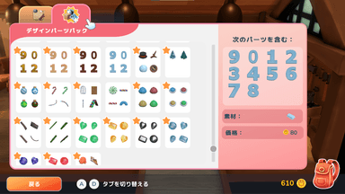 デザインテーブルを利用して、自分だけの家具を作りましょう!「リサイズ」、「回転」、「移動」などのシンプルで強力な機能で、素材の形を自由に変更して、パーツを組み合わせて、さらに色付ければ、理想の家具装飾が完成します。 壁紙や床材のデザインに限らず、服を設計して自分と全ての村人に着替えさせることもできます。